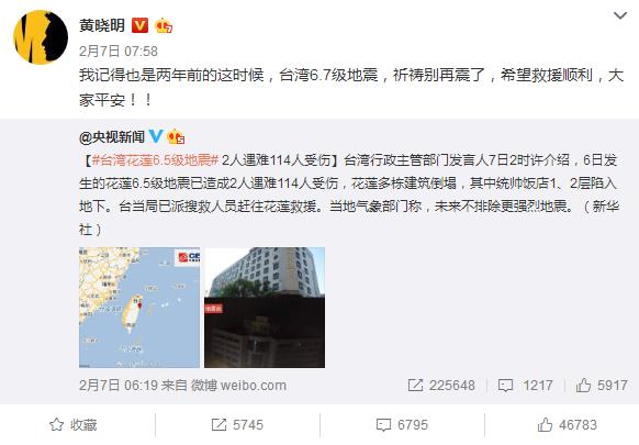 地震發生后,黃曉明、TFboys等明星們均在微博中為花蓮災區民眾祈福,表示“愿大家平安”。