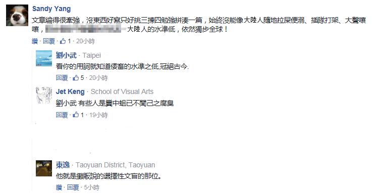 崗山之眼的不文明游客行徑一經(jīng)曝光便引發(fā)了許多臺(tái)灣網(wǎng)友的談?wù)摚?strong>其中很大一部分人認(rèn)為臺(tái)灣人的公德標(biāo)準(zhǔn)確實(shí)不高,需要改進(jìn),“臺(tái)灣人本來(lái)就沒(méi)有比較優(yōu)越,作過(guò)服務(wù)業(yè)的就知道”、“以前在機(jī)構(gòu)服務(wù)最討厭的就是臺(tái)灣人”。