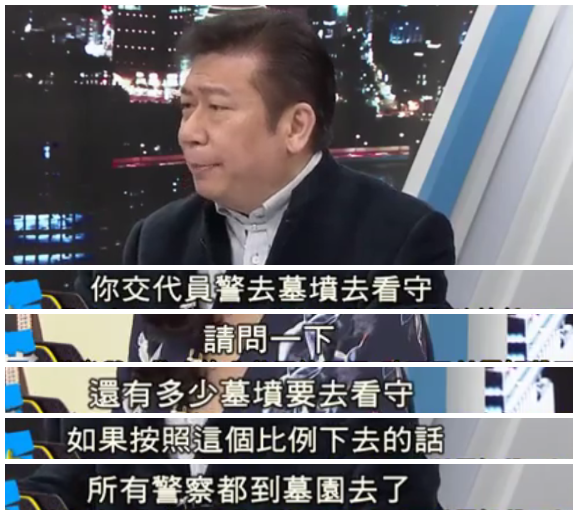 其實不用嘉賓特別說明,是個有常識的人都知道,警察哪能天天“守墓”啊?但不知道為什么,蔡英文上任之后,不光蔡英文自己覺得這件事兒稀松平常,連蔡當局的官員也跟著起哄,還要生編出一個警察守墓是為公共利益的名頭。戲是好戲,就是有點過啊綠營的老鐵們!