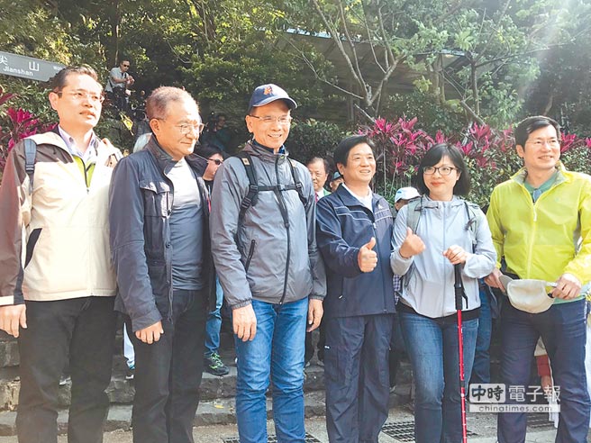 游錫堃(左三)偕同黨籍“立委”登觀音山硬漢嶺,高志鵬(左二)炮火四射。(圖片來(lái)源:臺(tái)灣《中時(shí)電子報(bào)》)