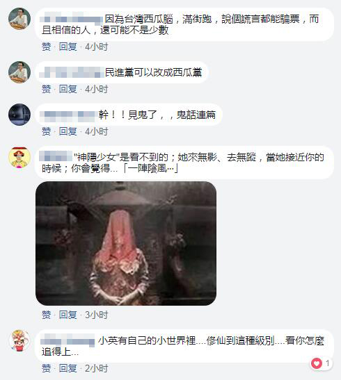 對(duì)于“神隱少女”蔡英文口中“你不知道我在接近你”的說法,網(wǎng)友貼出靈異少女的圖片大呼,“見鬼了,鬼話連篇”、 “神隱少女”是看不到的;她來無影、去無蹤,當(dāng)她接近你的時(shí)候;你會(huì)覺得……“一陣陰風(fēng)……”