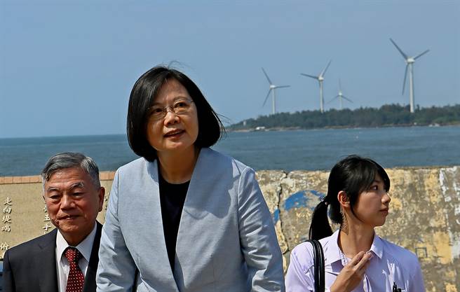 蔡英文(中)5日前往苗栗竹南訪視離岸風力發電示范機組。(圖片來源:臺灣《中時電子報》)