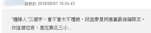 段宜康的這番“邊緣人”言論還沒(méi)等到呂秀蓮親自回應(yīng),網(wǎng)友們就看不下去了:“曾經(jīng)與這種人同黨還真倒霉”“有本事不要待在不分區(qū)”“人家邊緣至少還能當(dāng)副‘總統(tǒng)’,不像你自己其實(shí)邊緣到個(gè)極致,只能發(fā)個(gè)廢文”“你的曲棍球呢?”“支持段宜康=支持姚文智=支持民進(jìn)黨”“做人總比做畜牲好”“要不要吞曲棍球!