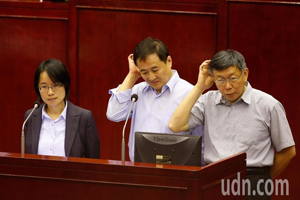 針對(duì)北農(nóng)是否送洋酒給民進(jìn)黨臺(tái)北市黨部,北農(nóng)總經(jīng)理吳音寧(左起)、董事長(zhǎng)陳景峻與市長(zhǎng)柯文哲下午在臺(tái)北市議會(huì)接受質(zhì)詢,吳音寧明確表示,沒有。(圖片來源:臺(tái)灣《聯(lián)合報(bào)》)