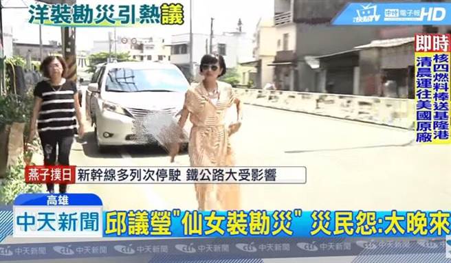 水災(zāi)過去13天后,邱議瑩終于關(guān)心燕巢危屋,但一身飄逸長裙洋裝外加時尚太陽眼鏡出現(xiàn),彷彿要去看秀,看到現(xiàn)場媒體還酸“太關(guān)心我了吧!”(圖片來源:臺灣中天新聞)