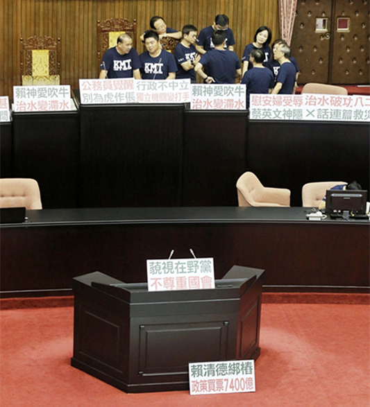 臺灣“立法院”今天開議,國民黨“立委”們一早就占據主席臺,排列出各式標語批評“行政院”。(圖片來源:臺灣《聯合報》)