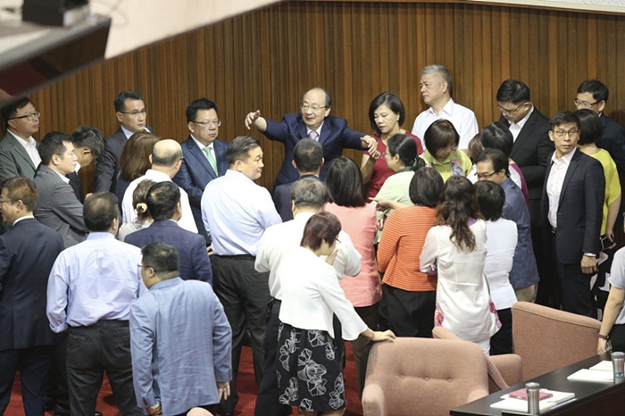 據報道,國民黨團書記長曾銘宗一早6時就先到場坐在主臺上準備,其余“藍委”接近8時陸續進場在主席臺上開會,展開占領行動。