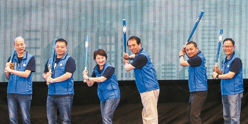圖為國民黨“六都”參選人韓國瑜(左起)、高思博、盧秀燕、陳學圣、侯友宜、丁守中日前在黨代會同臺造勢。(圖片來源:臺灣《聯合報》)