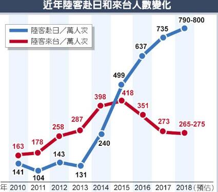 兩岸關(guān)系急轉(zhuǎn)直下,赴臺大陸游客漸減,赴日陸客大增。2017年大陸游客赴日比赴臺多462萬人次,估計(jì)今年訪日大陸游客可望上沖到790至800萬人次,幾乎是赴臺的3倍。