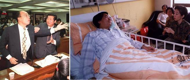 當年民進黨“立委”陳水扁(圖右)被時任“立委”的韓國瑜(圖左一)打了一拳, 住進臺大醫院急診,扁妻吳淑珍在床側探視。韓國瑜回憶說,沖突導火線是因為扁說了有辱“榮民”的一句話。