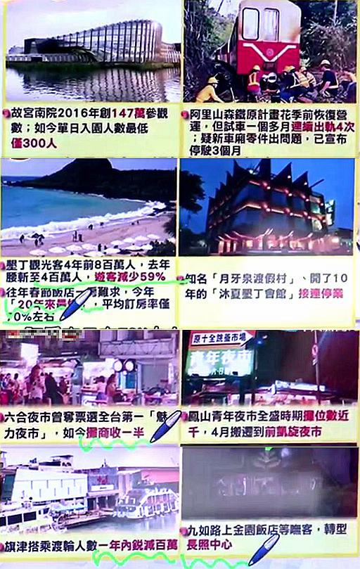 有臺媒總結了中南部觀光業如今面臨的9大慘境,包括墾丁觀光客從4年前的800萬到去年腰斬到400萬且今年春節訂房率更創“20年最低”;曾當選全臺第一“魅力夜市”的六合夜市現在只剩一半攤位;知名度假村和會館接連停業等……臺灣觀光救援服務協會理事長許高慶表示,如今對觀光業界只有“餓”字可以形容,大家過去“吃得好”,如今只能期待“吃得飽”。
