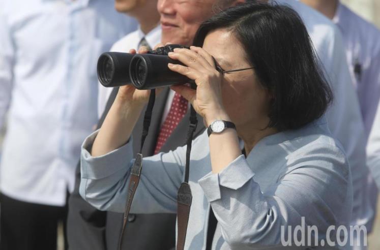 蔡英文到苗栗縣用望遠(yuǎn)鏡眺望,視察離岸風(fēng)力發(fā)電機(jī)。(圖片來源:臺(tái)灣《聯(lián)合報(bào)》)