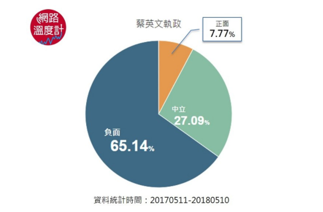 可以看到,從2017年5月到2018年5月,一年時間內,在網絡上,只有7.77%的網友對蔡英文執政有正面評價,其余部分,不滿意的負面評價高達65.14%。要是在淘寶上,這樣的賣家可能早就倒閉了。