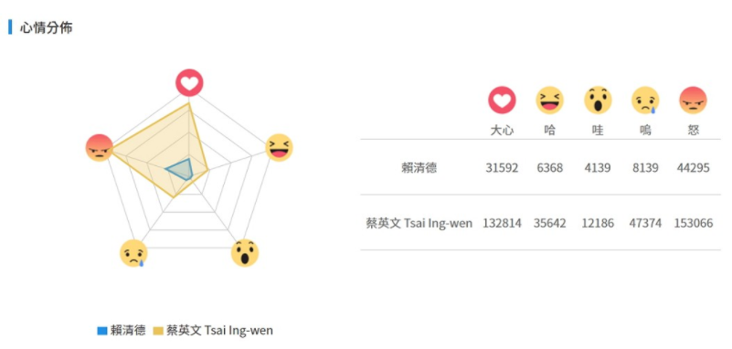 臺媒通過調查蔡英文、賴清德臉譜網發現,這一年內(20170510—20180510)跟進兩人話題并給予按鈕回應的網友當中,排除按“贊”的人次,按下心情按鈕的人則以“怒”最多,接著才是愛心,表示對他們的言論感到不滿的人是極多數。
