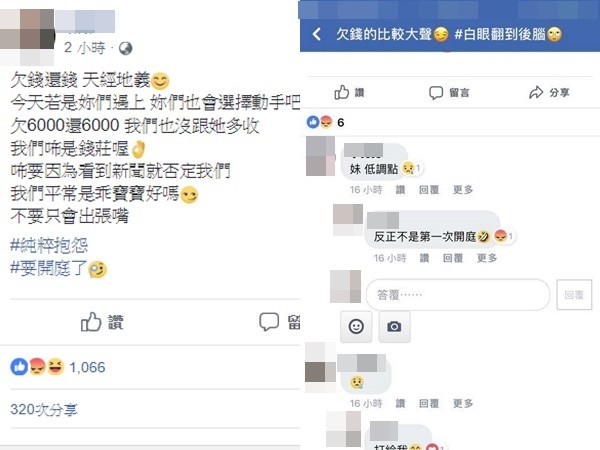事后,其中一名霸凌女子在臉譜網貼文指出,欠錢還錢,天經地義,今天若是你們遇上,你們也會選擇動手吧,欠6000還6000,我們也沒跟她多收,我們不是錢莊喔,不要因為看到新聞就否定我們,我們平常是乖寶寶好嗎,不要只會出張嘴。貼文引來眾多網友圍剿,可是女子卻反嗆“我們家也是有錢請律師的喔。”