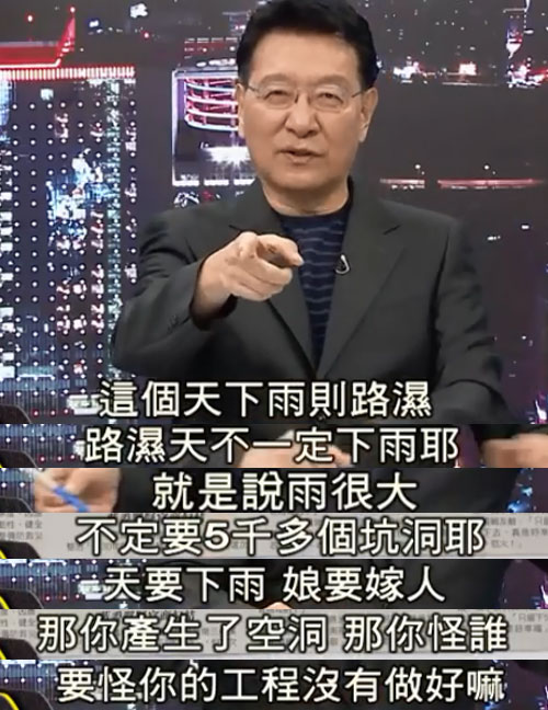 正所謂天要下雨,娘要嫁人,道路產(chǎn)生的問題,當然要歸咎于工程沒有做好,就像臺灣資深媒體人趙少康所言,“下雨則路濕,但路濕卻不一定下雨,雨大不大,跟坑洞的問題并沒有必然的聯(lián)系。”