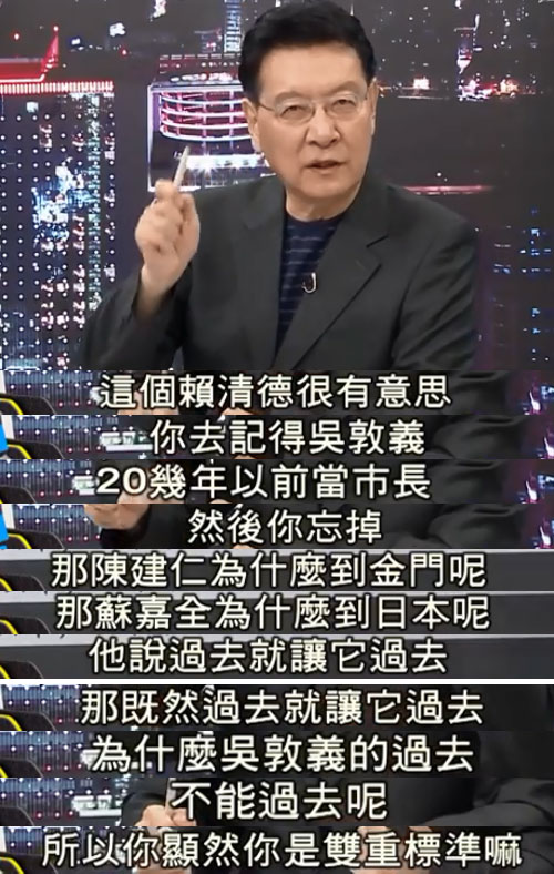 既然陳建仁、蘇嘉全、邱議瑩的過去能過去,那么為何吳敦義的過去不能過去呢?對此,趙少康給出了答案:雙重標準。