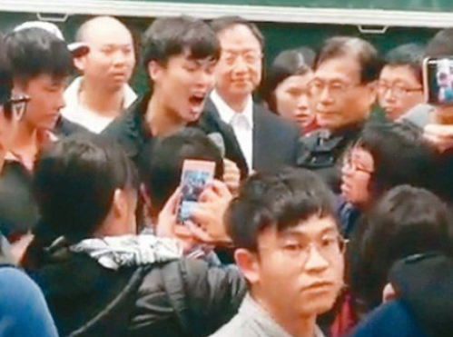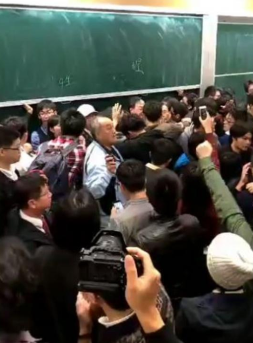 這些抗議者情緒激動,高呼“不要臉!”,將江宜樺圍在中間,不許他說話,不許他在黑板上寫字,不許他留在講臺,又不許他走!看一下當時的混亂畫面:
