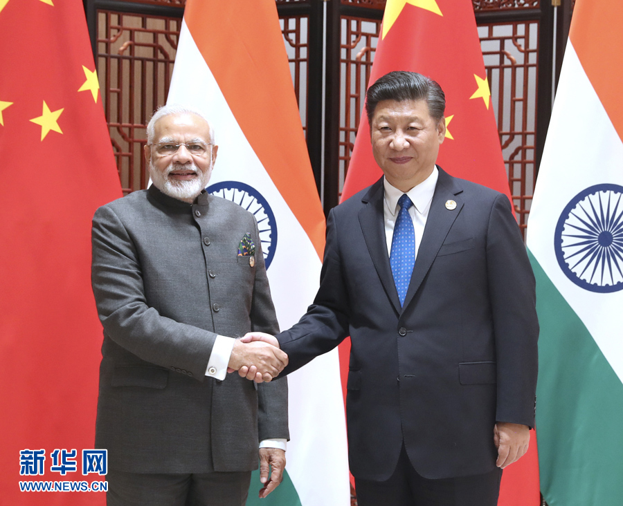 9月5日,國家主席習近平在廈門會見來華出席金磚國家領導人第九次會晤和新興市場國家與發展中國家對話會的印度總理莫迪。(新華社記者 馬占成攝)