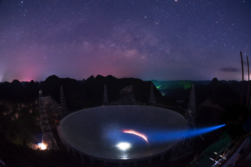 資料圖片:FAST在滿天繁星下呈現出的美麗景觀(2016年6月27日攝)。新華社記者 劉續 攝