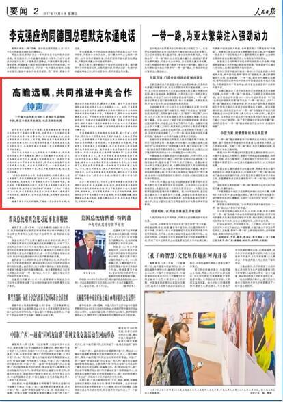 過去一段時間以來,習近平主席同特朗普總統保持了良好的溝通和互動,包括會晤、通話、通信,此次特朗普總統訪華將延續兩國元首的戰略溝通,將為中美關系的長遠發展指明方向,做出規劃。面對中美關系進一步發展的時代機遇,面對國際社會對中美加強合作的普遍期待,兩國應高瞻遠矚,相互照顧彼此利益和關切,妥善化解分歧和矛盾,共同推進中美合作,實現互利共贏。(人民日報)