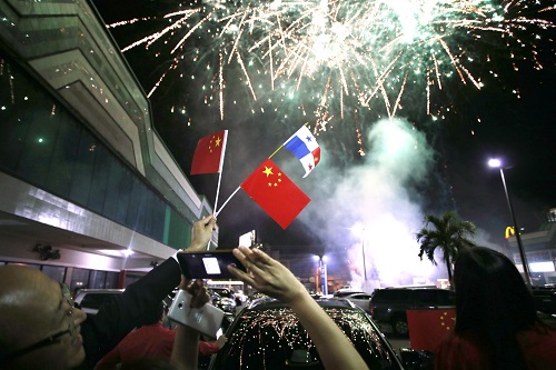 資料圖:6月12日,在巴拿馬首都巴拿馬城的華人社區(qū),人們在巴拿馬與中國建交的慶;顒由吓臄z煙花。新華社發(fā)