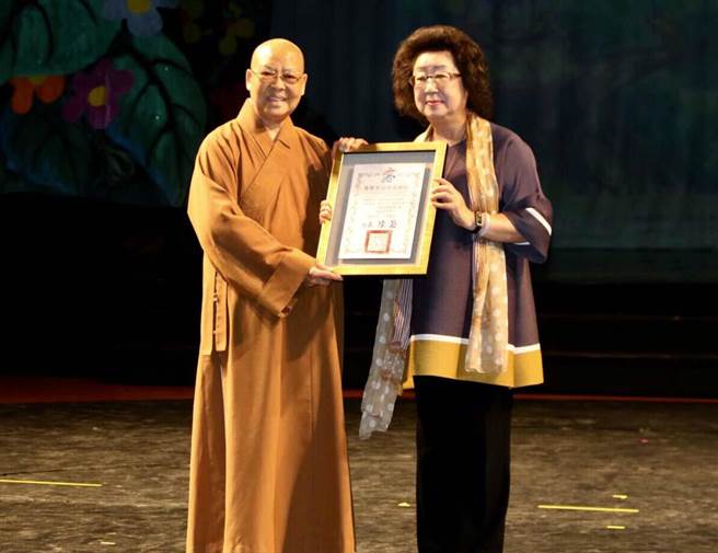 高雄市教育部門負責人向佛光山慈容法師授予獎狀,感謝佛光山致力教育事業推廣。(圖片來源:臺灣“中國時報”)