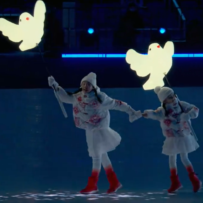 北京冬奧會開幕式上,節目《閃亮的雪花》中“掉隊的小鴿子”被拉回隊伍。(央視視頻直播截圖)