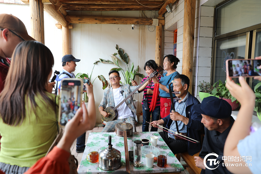 “轉軸撥弦三兩聲,未成曲調先有情。”在武威涼州賢孝非遺傳承人賈旭峰的院子里,兩岸媒體人圍著幾位民俗表演藝人而坐,聽涼州賢孝的傳承與發展,感受中華民俗文化的魅力。在記者提議下,由賈旭峰以武威當地口音演唱開頭,現場兩岸同胞合唱膾炙人口的歌曲——《外婆的澎湖灣》。當武威口音遇上“臺灣腔”,當寶島臺灣的歌曲遇上祖國大西北的特色民俗,一場新奇的文化碰撞上演。院落中一片歡聲笑語,歌聲仿佛穿過海峽,在兩岸回蕩。