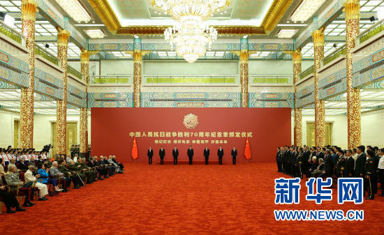 9月2日,中共中央總書(shū)記、國(guó)家主席、中央軍委主席習(xí)近平在北京人民大會(huì)堂向30名抗戰(zhàn)老戰(zhàn)士老同志、抗戰(zhàn)將領(lǐng)、為中國(guó)抗戰(zhàn)勝利作出貢獻(xiàn)的國(guó)際友人或其遺屬代表頒發(fā)中國(guó)人民抗日戰(zhàn)爭(zhēng)勝利70周年紀(jì)念章并發(fā)表重要講話。新華社記者龐興雷攝