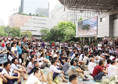 ▲ 上海南京路步行街世紀廣場上擠滿了觀看閱兵式實況轉播的人群。 本報記者 李治國攝