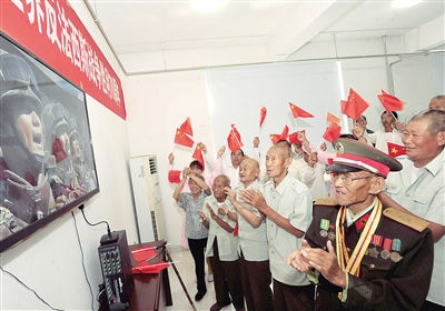 “我們感到十分高興和榮耀,能看到如今國家的繁榮昌盛,就算當年我們參加的戰斗很艱苦,可是為了捍衛國家主權、民族尊嚴,為了現在社會的和諧穩定,流血犧牲都是值得的。”老干部王奎說。當聽到《保衛黃河》《游擊隊歌》等抗戰革命歌曲響起時,現場許多老干部都情不自禁地跟著大聲唱。看到鮮艷的五星紅旗冉冉升起,抗戰老兵自豪地向國旗敬軍禮。