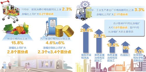 11月份,CPI漲幅比上月擴大0.2個百分點,同比漲幅連續3個月擴大。其中,食品價格同比上漲4.0%,漲幅擴大0.3個百分點;非食品價格上漲1.8%,漲幅擴大0.1個百分點。