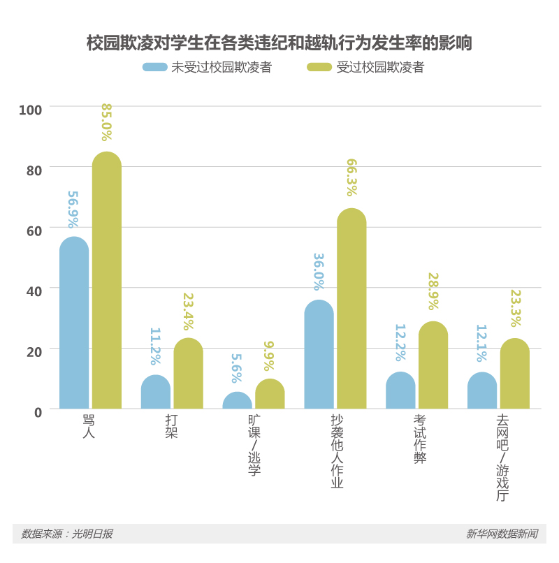 除了對心理健康水平的影響之外,校園欺凌也會使受害的學生由于受到暴力傷害的投射反應,出現各種違紀和越軌行為,甚至反過來去欺凌其他弱小的同學。在各類違紀和越軌行為中,遭受過校園欺凌的學生的發生率都差不多比沒有受過校園欺凌的學生高一倍以上。