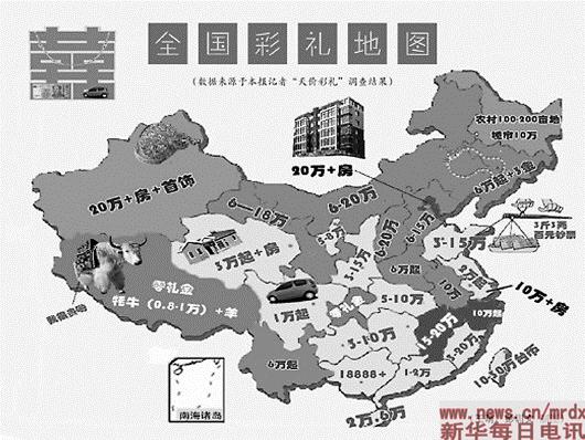 媒體記者基于調查而繪制的新版《全國彩禮地圖》,直觀地反映出全國彩禮分布情況的顯著特征——“西部高東部低,山村高城郊低”。在河南、山東、貴州、陜西、甘肅等地,更表現出“越是貧困地區,越出現高價彩禮”的特點。從某種程度上說,彩禮地圖的高低分布,基本上契合了當地經濟發展水平,即彩禮金額的多少與當地居民人均可支配收入大致呈反比。結婚要不要收彩禮,要收多少彩禮,也與當地男女比例的分布情況相關,男女比例相差越懸殊,男多女少的局面越嚴重,“天價彩禮”之風越惡劣。反之,如果男女比例相差不大,分布均衡,則彩禮現象也鮮有容身之地。