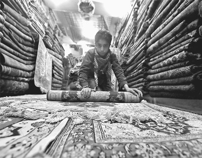 在“地毯大王”奧薩馬的店里,一名少年正在卷起鋪開的地毯。本報記者 焦翔攝