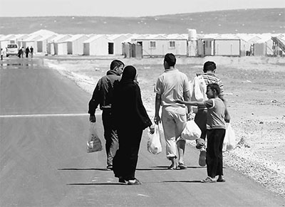 一座位于敘約邊境的敘利亞新難民營日前落成,這座面積15平方公里的難民營可收留5萬名難民。圖為幾名敘利亞人正前往新難民營。人民視覺