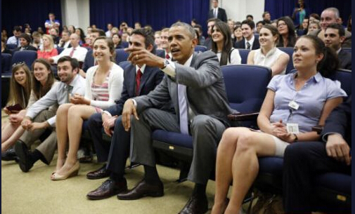 2014年7月1日,美國總統奧巴馬在艾森豪威爾行政辦公室與員工一起看美國和比利時之間的世界杯足球賽。