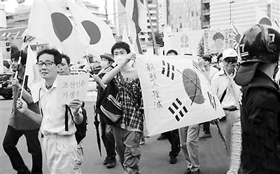 日本右翼團體也不甘落后。4月20日,日本右翼團體成員在東京市中心游行。游行中出現了被涂鴉破壞的太極旗,還在樸槿惠和慰安婦相片上寫著“乞丐、賣淫女”。