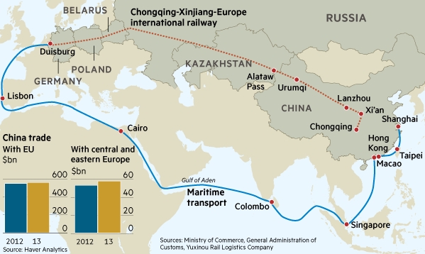 習(xí)近平提出這些雄偉構(gòu)想的一個(gè)動(dòng)機(jī)在于,他希望加強(qiáng)中國(guó)內(nèi)地、特別是西部地區(qū)與歐洲的聯(lián)系。假如這些倡議成真,那或許將相當(dāng)于自中國(guó)20年前開始成為國(guó)際貿(mào)易的重要參與者以來(lái),全球貿(mào)易路線的一次最大洗牌。