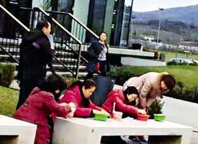 數名大媽寒天中蹲在Gucci名店前的石椅上吃泡面。(圖片來源網絡)