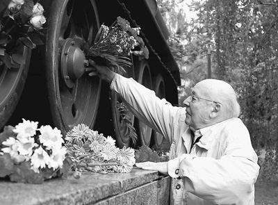二戰(zhàn)老兵韋爾納向德俄博物館的蘇聯(lián)紅軍坦克獻花。