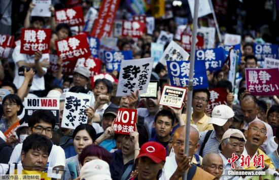 7月16日,在日本東京國會附近,人們手舉標(biāo)語參加抗議安保法案游行活動。15日至16日,日本首相安倍晉三及執(zhí)政聯(lián)盟強(qiáng)行推動國會眾議院通過安保法案,引發(fā)日本民眾強(qiáng)烈抗議。