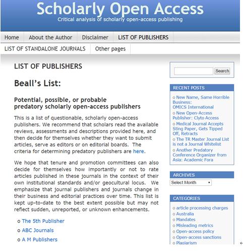 2009年開始,美國知名教授Jeffrey Beall涉足學術(shù)開放存取出版的問題研究,近年來不斷更新開放存取期刊出版社的黑名單,提醒作者謹慎投稿和參與編輯或編委。2013年10月14日更新的黑名單包括439家期刊/出版社。