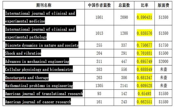 在OA期刊發(fā)展過程中,來自中國的論文數(shù)量龐大,而這一重要的影響因素不可忽視。喻海良曾無意中發(fā)現(xiàn)兩個不是很有名的期刊,中國作者發(fā)文居然均超過1000篇,于是整理出10個中國作者發(fā)文超過60%的國外OA期刊。