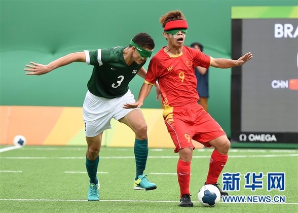 中國隊球員王周彬(右)在比賽中拼搶。在里約殘奧會男子盲人足球半決賽中,中國隊以1比2負于巴西隊,無緣決賽。新華社記者李鋼攝