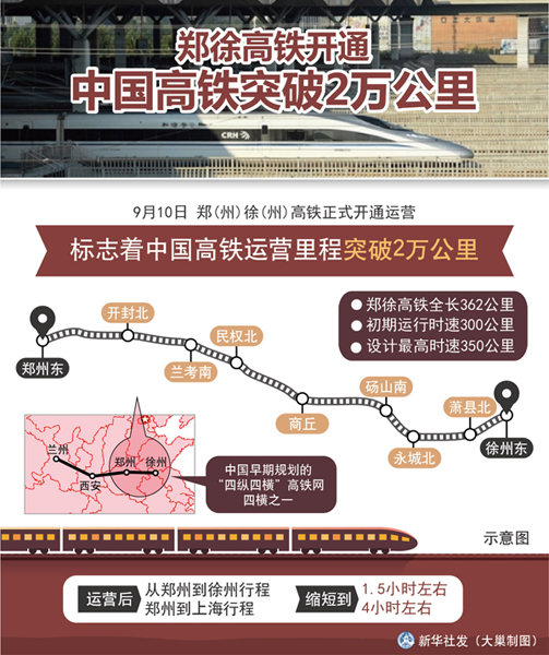 9月10日,鄭徐高鐵開通。中國高鐵里程突破2萬公里。新華社發(fā) 大巢制圖