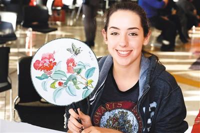 11月14日,一名美國學生在“中國文化周”活動中展示自己上色的中國團扇。