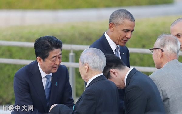 資料圖:2016年5月27日,安倍與奧巴馬在廣島與核爆受害者交談。(《日本經(jīng)濟新聞》網(wǎng)站)