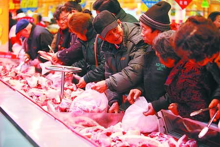 資料圖片:消費(fèi)者在一家超市內(nèi)選購豬肉。